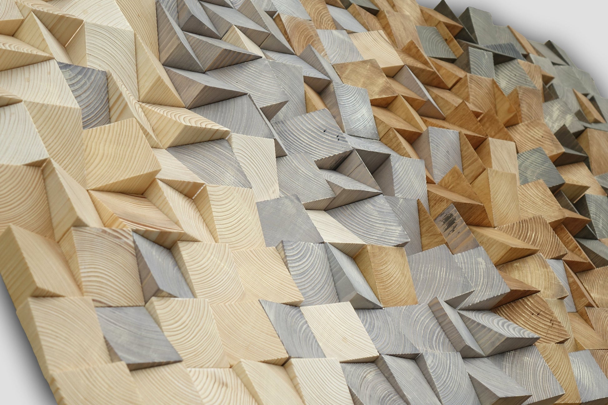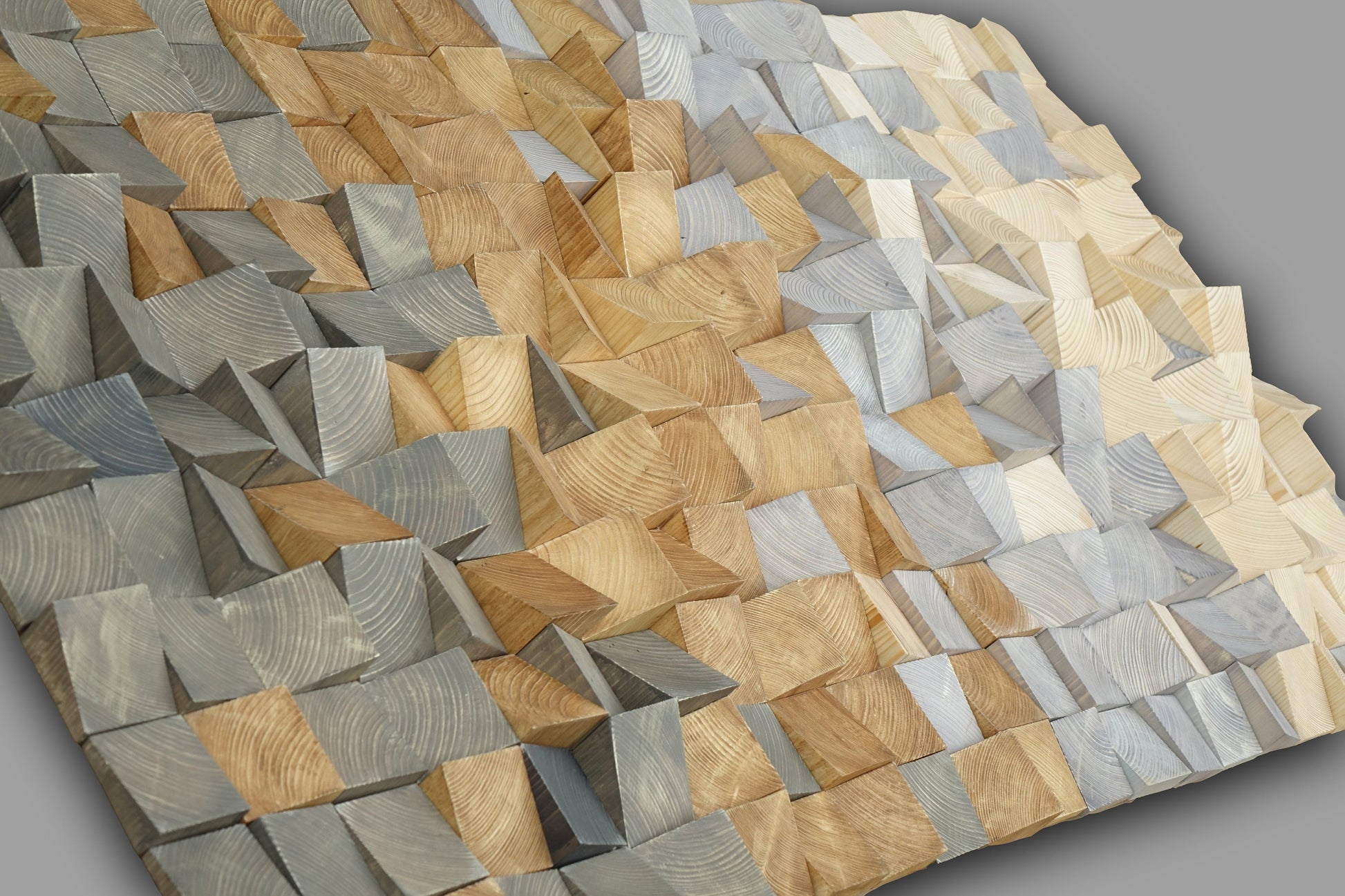 This textured earthy toned wooden wall pulls together variously stained wooden blocks to create a one in a kind natural mosaic wall hanging in any home. Each piece of wood was separately sanded and smoothen for clear exposition of rings drawing. To create this original wooden mosaic wall decor we cut the wooden pieces in the way which creates 3D effect with the depth ranges up to 1.8" (4,5cm). I used and mixed on my own several wood dyes to create unique shades of gray and brown colors for this modern wood wall art. For hours you can contemplate the unique variety of natural patterns and colors of this modern wooden wall art.