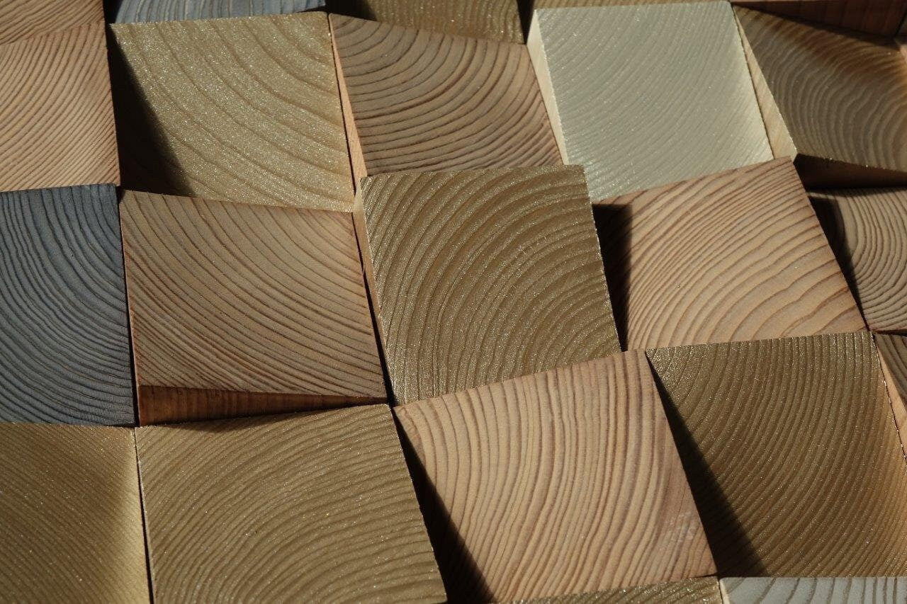 The wooden squares are handcrafted, impregnated with organic oil and painted with top quality wood stains in natural, light gray, brown and dark gray. About 1/3 of the wooden blocks are painted with metallic colors similar to those painted with stain.